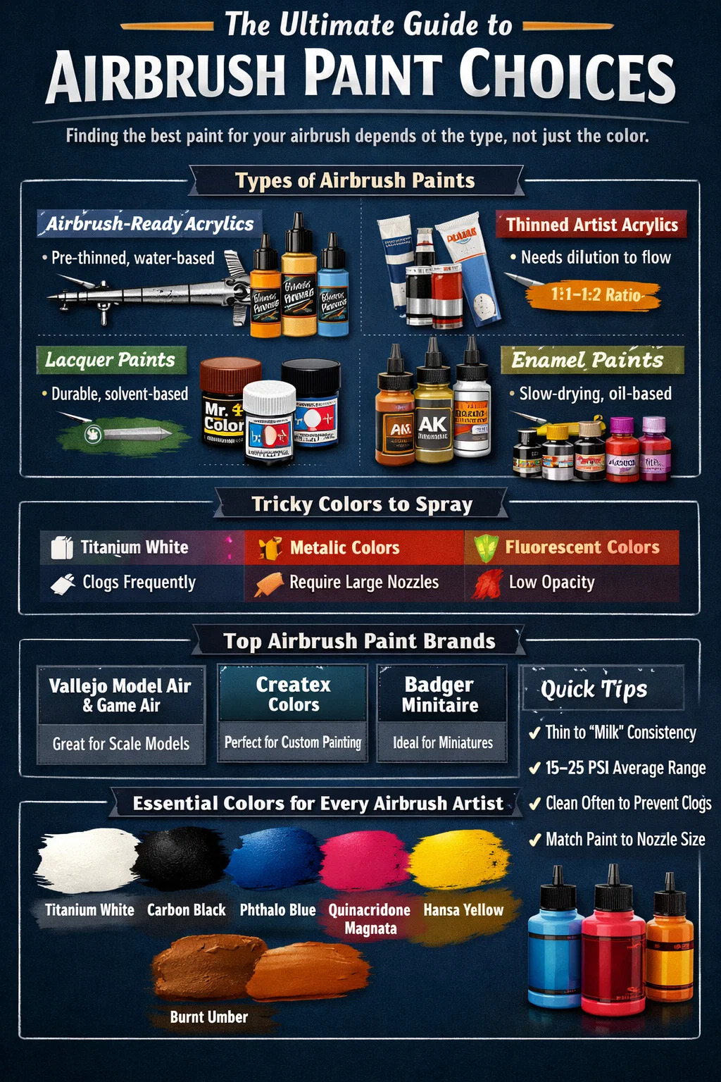 Înainte de a vă scufunda în anumite nuanțe, este important să înțelegeți că un aerograf nu distinge între roșu și albastru, ci distinge între vopsea care curge și vopsea care se înfundă. Mediul (tipul de vopsea) este cel mai mare factor în performanța aerografului. Iată o defalcare a principalelor categorii:
