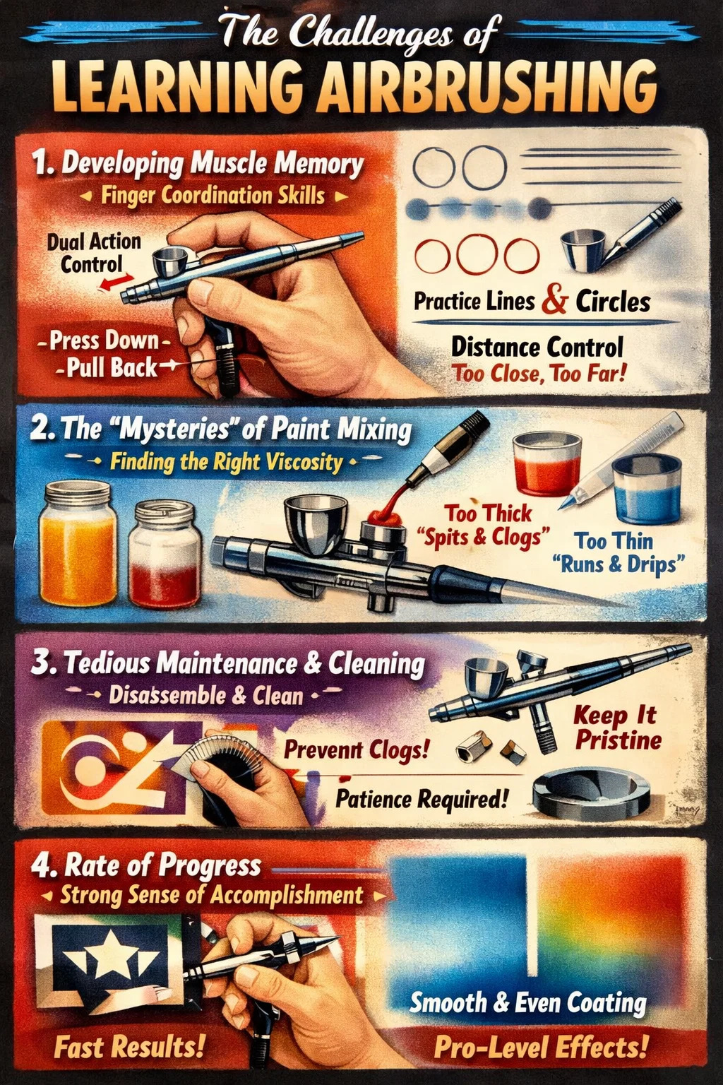 Învățarea aerografiei este o abilitate care este „ușor de început, dar necesită un efort de stăpânit”. Spre deosebire de pensulele sau pixurile tradiționale care contactează direct suprafața, este mai mult ca o tehnică de manipulare a „vântului colorat”.